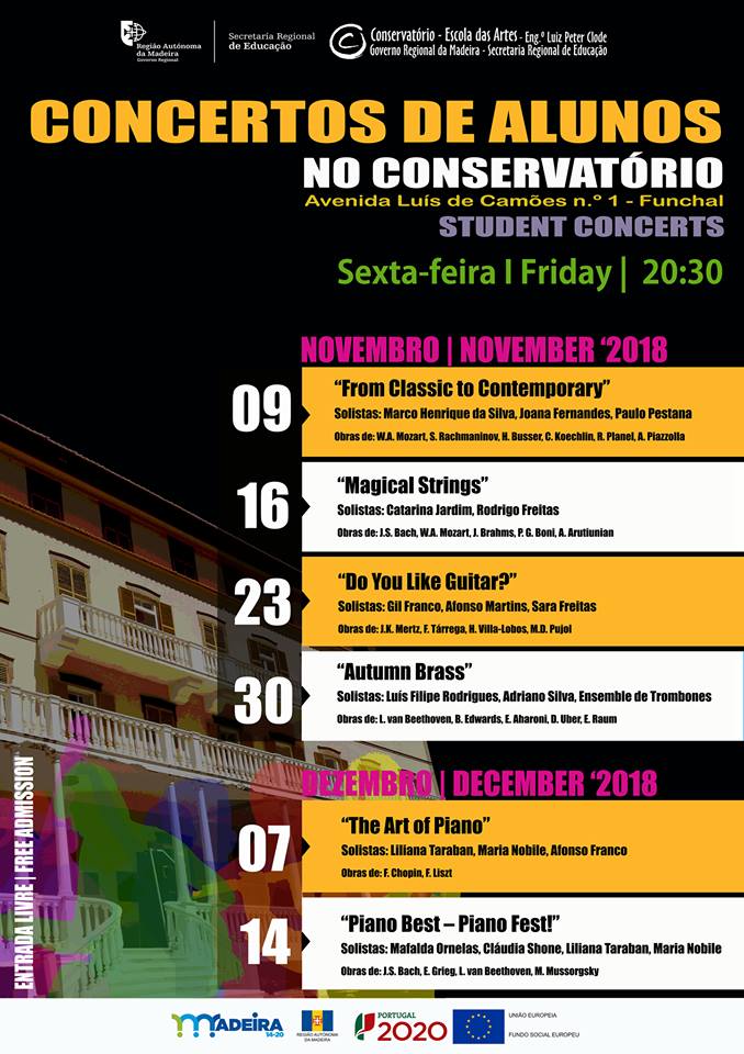 Among the events stand out the Concerts of students of the Instrumental Professional Course, on Friday, at 8.30 pm at the Conservatory's Noble Hall. These concerts usually have a full house and the public is mostly tourists, who already contact the Conservatory by e-mail about the event schedule so they can schedule their vacation visits in this period. The first of these concerts takes place on November 9 and runs until December 14.